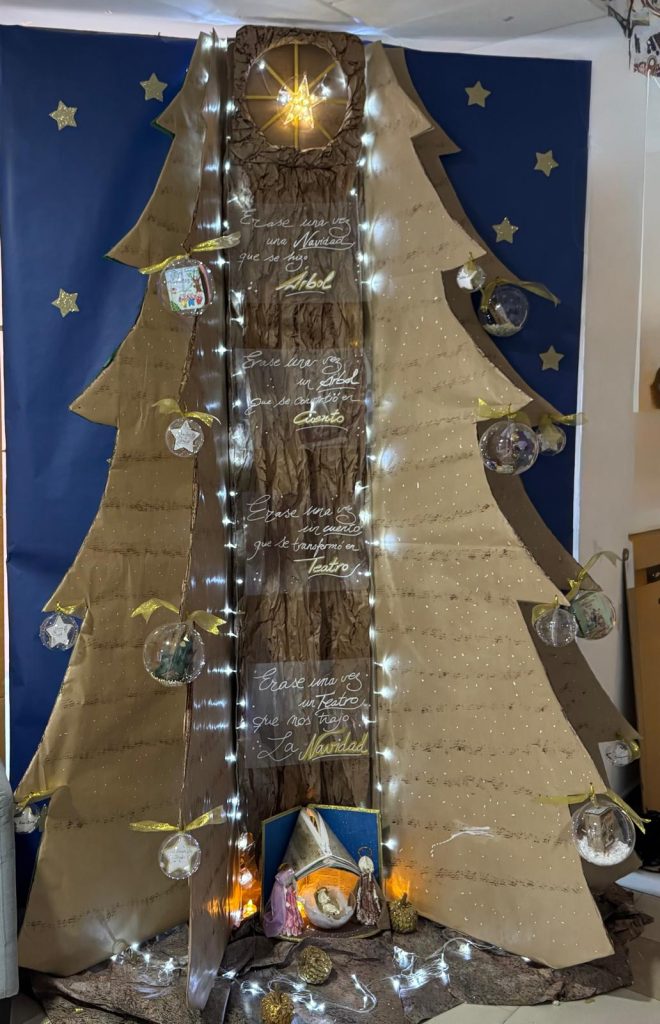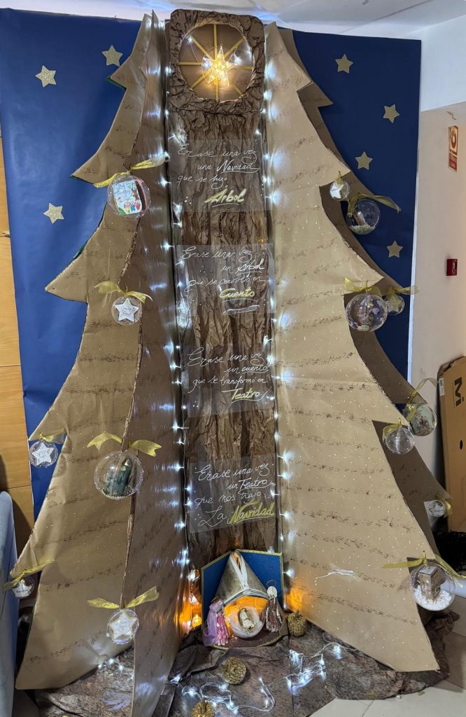 Nuestro árbol de Navidad, diseñado de forma original y completamente manual, refleja el espíritu del proyecto anual del centro: “Una Navidad de cuento”. A través de su decoración, hemos querido unir la magia de estas fechas con la imaginación y los valores que transmiten los relatos clásicos y contemporáneos.