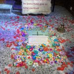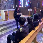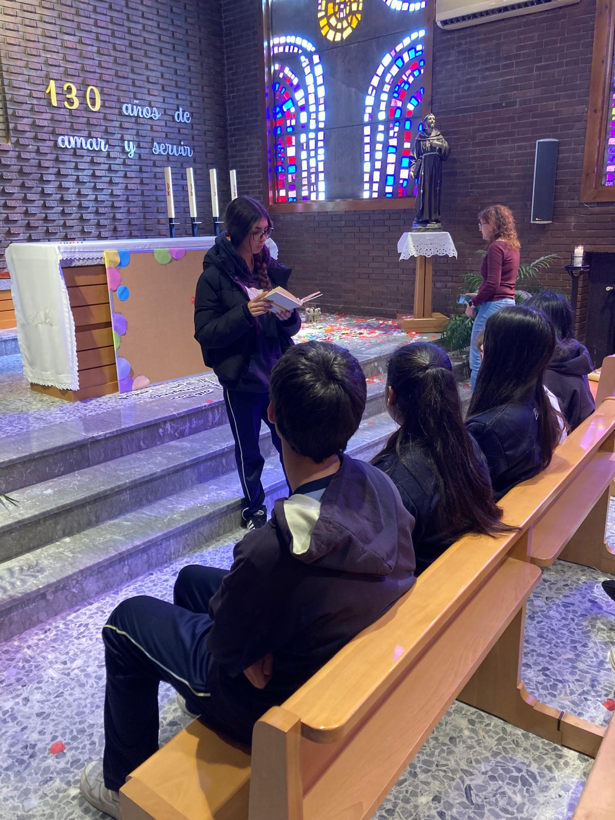 El día central de la celebración, el ambiente de recogimiento y alegría fue palpable. Cada clase se acercó a su tumba para rendirle un homenaje muy visual y sentido: depositamos flores de papel confeccionadas por los propios alumnos, llenando el espacio de color y cariño. Además, cada grupo leyó una oración ante su tumba, compartiendo un momento de silencio y gratitud por su vida y su ejemplo de fe.